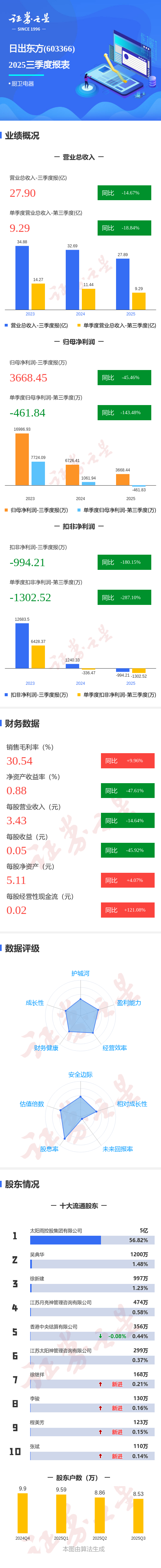 图解日出东方三季报:第三季度单季净利润同比下降143.49%