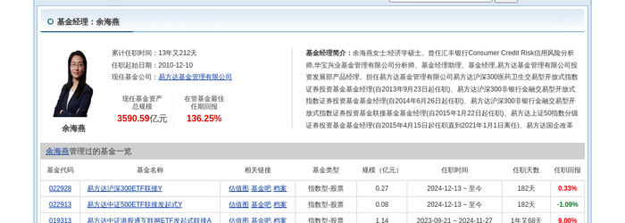 简历显示,余海燕女士:经济学硕士。曾任汇丰银行Consumer Credit Risk信用风险分析师,华宝兴业基金管理有限公司分析师、基金经理助理、基金经理,易方达基金管理有限公司投资发展部产品经理。担任易方达基金管理有限公司易方达沪深300医药卫生交易型开放式指数证券投资基金基金经理(自2013年9月23日起任职)、易方达沪深300非银行金融交易型开放式指数证券投资基金基金经理(自2014年6月26日起任职)、易方达沪深300非银行金融交易型开放式指数证券投资基金联接基金基金经理(自2015年1月22日起任职)、易方达上证50指数分级证券投资基金基金经理(自2015年4月15日起任职直到2021年1月1日离任)、易方达国企改革指数分级证券投资基金基金经理(自2015年6月15日至2021年1月1日任职)、易方达军工指数分级证券投资基金基金经理(自2015年7月8日至2021年1月1日任职)、易方达证券公司指数分级证券投资基金基金经理(自2015年7月8日起任职直到20211年1月1日离任)、易方达沪深300交易型开放式指数发起式证券投资基金基金经理(自2016年4月16日起任职)、易方达中证500交易型开放式指数证券投资基金基金经理(自2016年4月16日起任职)、易方达沪深300交易型开放式指数发起式证券投资基金联接基金基金经理(自2016年4月16日起任职)、易方达中证海外中国互联网50交易型开放式指数证券投资基金基金经理(自2017年1月4日起任职)、易方达中证军工交易型开放式指数证券投资基金基金经理(自2017年7月14日至2021年4月15日)、易方达中证全指证券公司交易型开放式指数证券投资基金基金经理(自2017年7月27日至2021年4月15日)、易方达沪深300医药卫生交易型开放式指数证券投资基金联接基金基金经理(自2017年11月22日起任职)、易方达黄金交易型开放式证券投资基金联接基金基金经理(自2018年8月11日至2021年4月15日)、易方达恒生中国企业交易型开放式指数证券投资基金联接基金基金经理(自2018年8月11日起任职)、易方达黄金交易型开放式证券投资基金基金经理(自2018年8月11日至2021年4月15日)、易方达恒生中国企业交易型开放式指数证券投资基金基金经理(自2018年8月11日起任职)、易方达中证海外中国互联网50交易型开放式指数证券投资基金联接基金基金经理(自2019年1月18日起任职)、易方达中证500交易型开放式指数证券投资基金发起式联接基金基金经理(自2019年3月20日起任职),易方达日兴资管日经225交易型开放式指数证券投资基金(QDII)基金经理(自2019年6月12日起任职)。2022年11月1日起任易方达中证军工交易型开放式指数证券投资基金、易方达中证军工指数证券投资基金(LOF)基金经理。曾任易方达中证港股通互联网交易型开放式指数证券投资基金、易方达中证港股通互联网交易型开放式指数证券投资基金发起式联接基金基金经理。