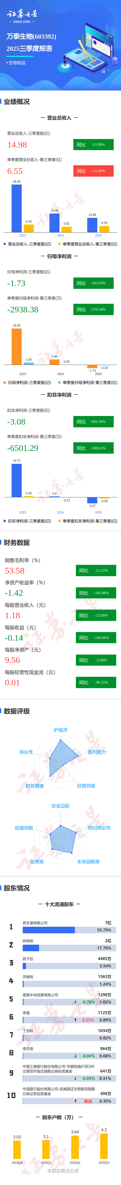 证券之星消息,万泰生物2025年三季报显示,前三季度公司主营收入14.98亿元,同比下降23.09%;归母净利润-1.73亿元,同比下降165.04%;扣非净利润-3.08亿元,同比下降850.36%;其中2025年第三季度,公司单季度主营收入6.55亿元,同比上升12.5%;单季度归母净利润-2938.38万元,同比下降576.34%;单季度扣非净利润-6501.29万元,同比下降188.63%;负债率14.6%,投资收益6651.1万元,财务费用-1134.23万元,毛利率53.58%。