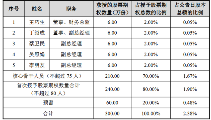 该计划拟授予股票期权数量为300万份,约占公司股本总额的2.38%。其中,首次授予240万份,约占公司股本总额的1.90%;预留60万份,约占公司股本总额的0.48%。首次授予的股票期权行权价格定为28.04元/份。