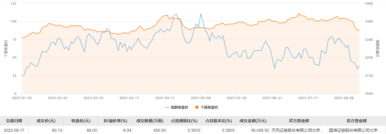 8月17日大宗交易成交450万股,成交额3.61亿元,占当日总成交额的29.07%,成交价80.13元,较市场收盘价88元折价8.94%。
