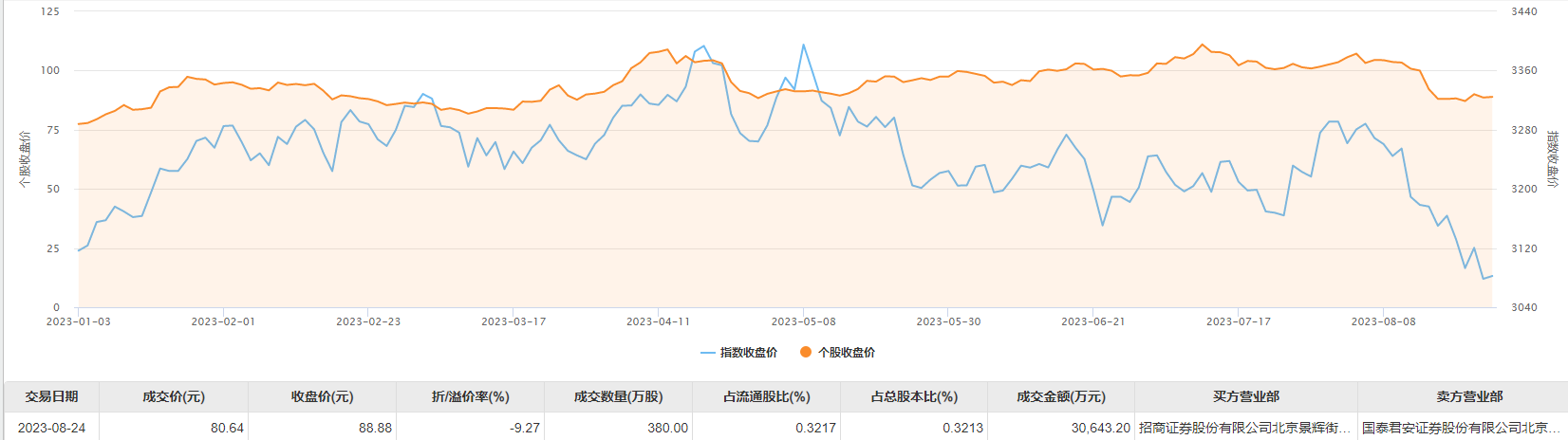 今日大宗交易成交380万股,成交额3.06亿元,占当日总成交额的40.08%,成交价80.64元,较市场收盘价88.88元折价9.27%。