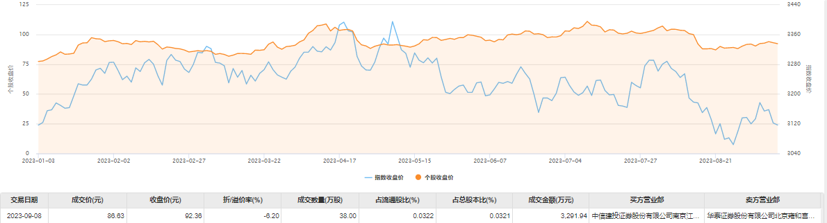 9月8日大宗交易成交38万股,成交额3291.94万元,占当日总成交额的10.71%,成交价86.63元,较市场收盘价92.36元折价6.2%。
