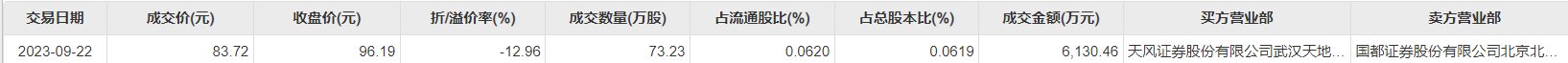 9月22日大宗交易成交73.23万股,成交额6130.46万元,占当日总成交额的8.3%,成交价83.72元,较市场收盘价96.19元折价12.96%。