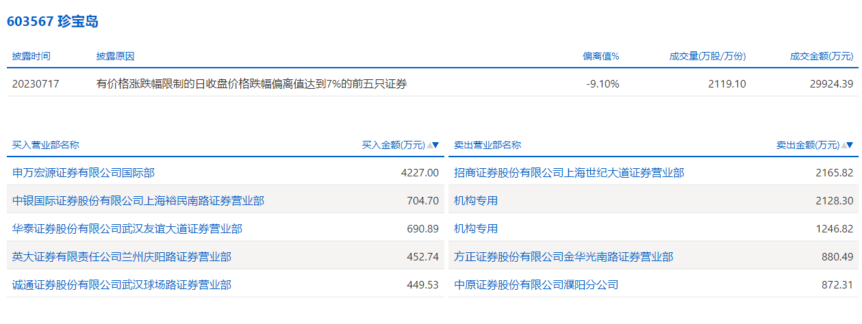 7月17日,珍宝岛今日跌停,龙虎榜数据显示,上榜营业部席位全天成交1.38亿元,占当日总成交金额比例为46.18%。其中,买入金额为6524.85万元,卖出金额为7293.76万元,合计净卖出768.9万元。