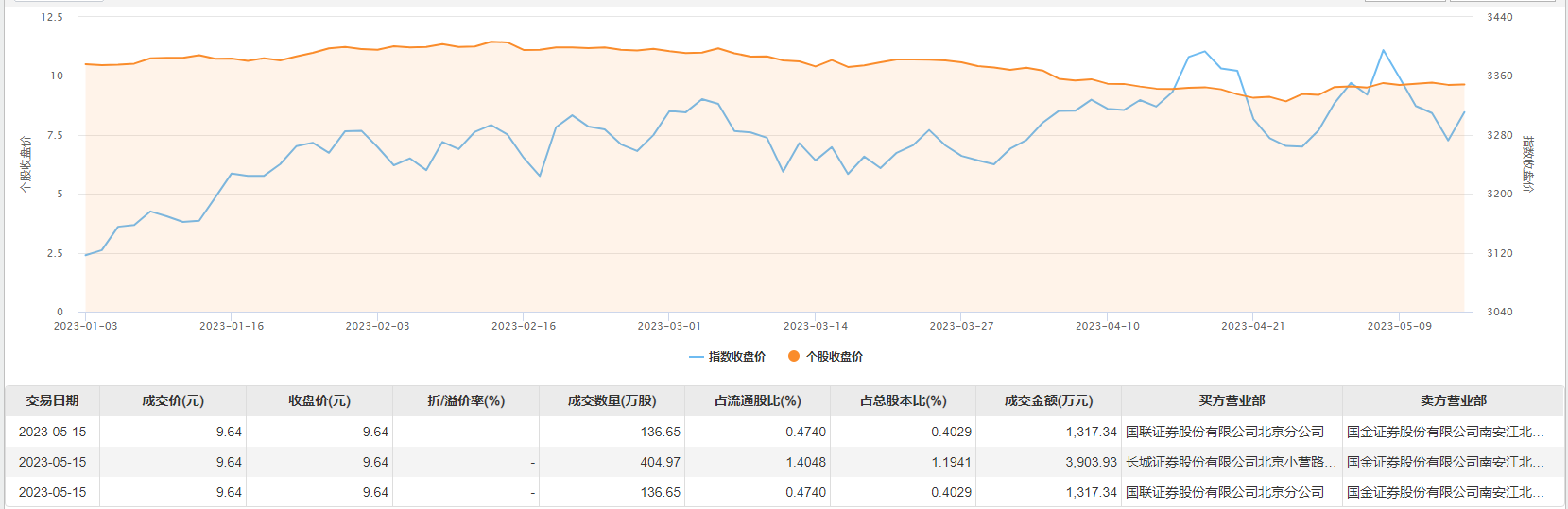 5月15日大宗交易成交678.27万股,成交额6538.61万元,占当日总成交额的79.62%,成交价9.64元,较市场收盘价9.64元持平。