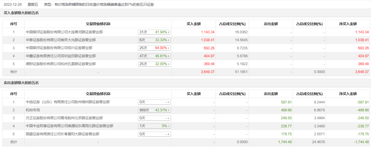 汇金通12月29日涨停,全天换手率达2.39%,振幅达2.12%。龙虎榜数据显示,营业部席位合计净买入1904.89万元。其中,机构合计净卖出489.66万元。此外,中国银河证券大连黄河路证券营业部、华泰证券南京大光路证券营业部分别买入1143.34万元、1038.41万元;中信证券(山东)胶州湖州路证券营业部、方正证券青岛胶州北京路证券营业部分别卖出587.81万元、249.50万元。