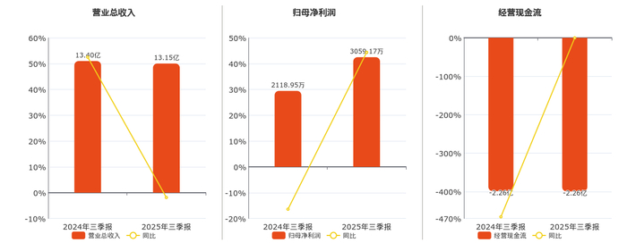 公司营业总收入为13.15亿元,在已披露的同业公司中排名第13,较去年同报告期营业总收入减少2507.62万元,同比较去年同期下降1.87%。归母净利润为3059.17万元。经营活动现金净流入为-2.26亿元,在已披露的同业公司中排名第24,较去年同报告期经营活动现金净流入减少37.81万元。