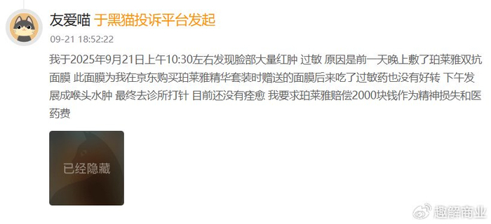 9月21日,一消费者投诉称,使用珀莱雅双抗面膜的第二天,脸部大量红肿、过敏,吃了过敏药也没有好转,下午发展成喉头水肿,最终去诊所打针,截至投诉时还没有痊愈。