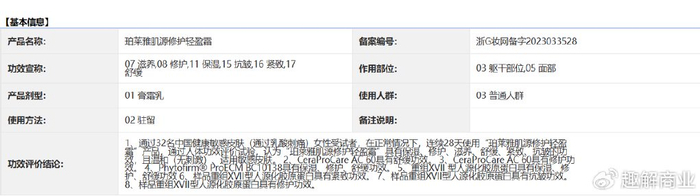 然而,国家药监局官网的国产普通化妆品备案信息显示,该产品的备案功效仅包括滋养、修护、保湿、抗皱、紧致和舒缓,并未包含 “抗初老”“耐老” 等类似表述。