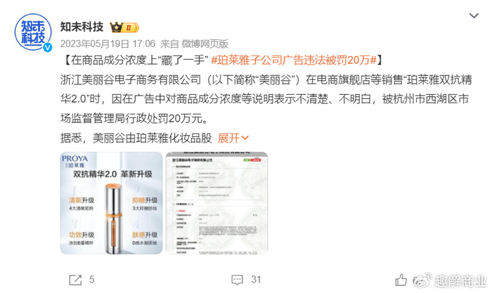 2023年,珀莱雅的全资子公司浙江美丽谷电子商务有限公司曾因广告违法受到行政处罚。西湖区市场监管局调查查明,该公司在“珀莱雅双抗精华2.0”的广告里,宣称含有“2%麦角硫因”“1%脱羧肌肽”,可实际这些百分比是麦角硫因溶液、脱羧肌肽溶液在产品中的质量占比,并非麦角硫因、脱羧肌肽纯物质的含量。