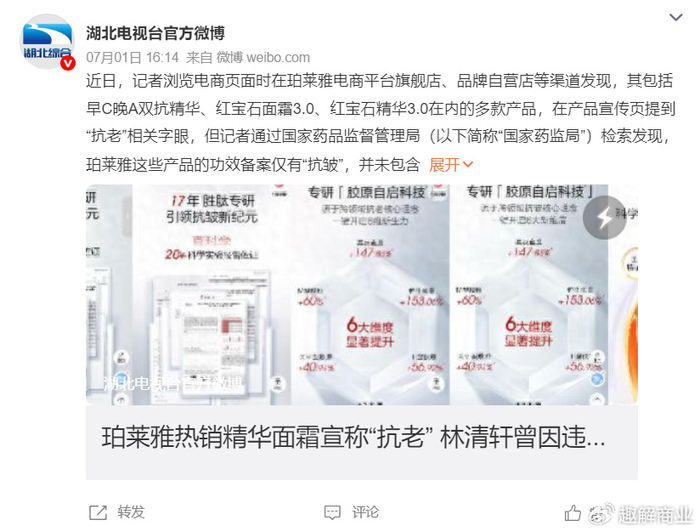 据媒体报道,在珀莱雅电商平台旗舰店、品牌自营店等渠道,包括早C晚A双抗精华、红宝石面霜3.0、红宝石精华3.0在内的多款产品,在产品宣传页提到“抗老”相关字眼,但媒体通过国家药品监督管理局(以下简称“国家药监局”)检索发现,珀莱雅这些产品的功效备案仅有“抗皱”,并未包含“抗老”。