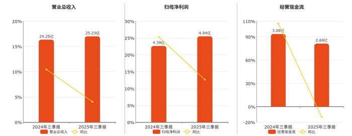 公司营业总收入为25.23亿元。归母净利润为4.94亿元。经营活动现金净流入为2.69亿元,较去年同报告期经营活动现金净流入减少4087.08万元,同比较去年同期下降13.21%。