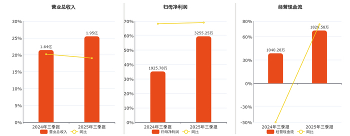 公司营业总收入为1.95亿元。归母净利润为3255.25万元。经营活动现金净流入为1829.58万元。