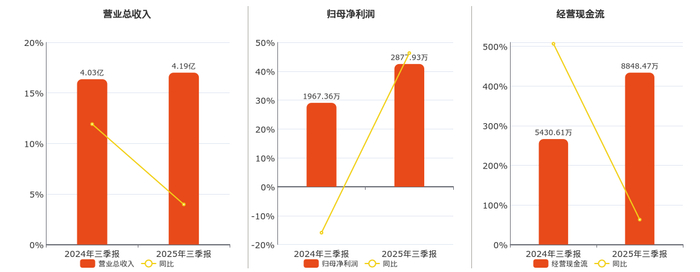 公司营业总收入为4.19亿元。归母净利润为2877.93万元。经营活动现金净流入为8848.47万元。