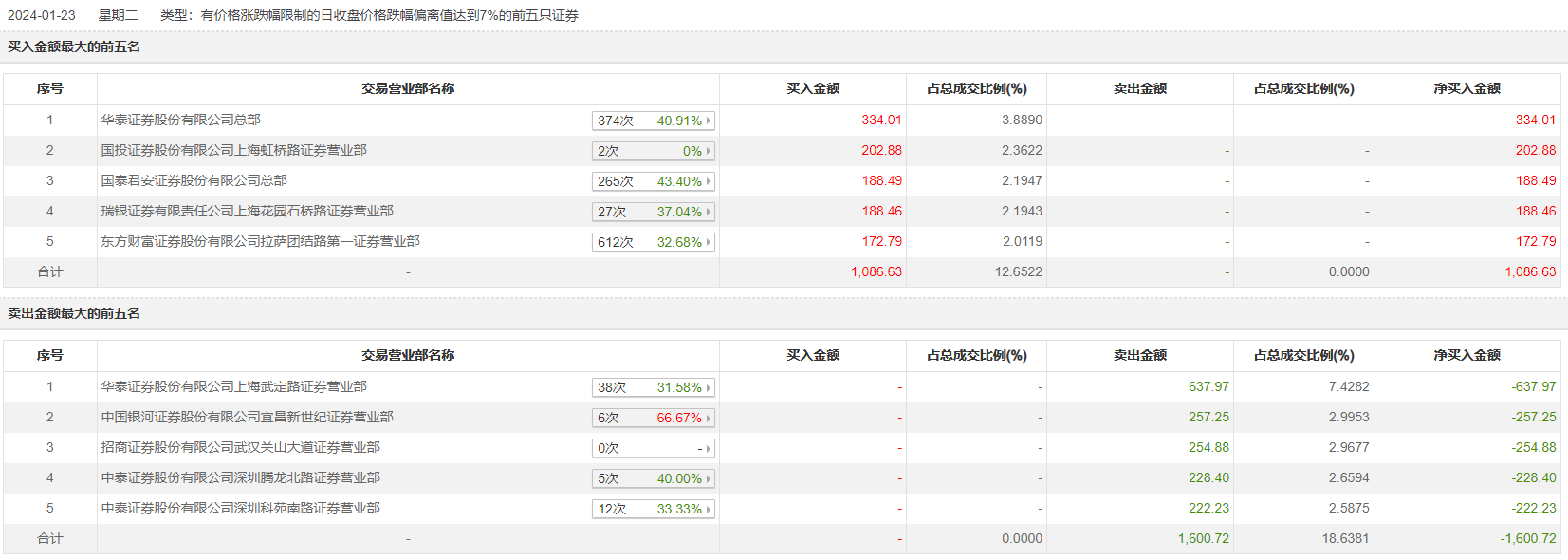 1月23日,春光科技今日跌停,全天换手率达4.98%,振幅达3.55%。龙虎榜数据显示,营业部席位合计净卖出514.1万元。其中,华泰证券上海武定路证券营业部、中国银河证券宜昌新世纪证券营业部分别卖出637.97万元、257.25万元;华泰证券总部、国投证券上海虹桥路证券营业部分别买入334.01万元、202.88万元。