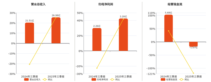 公司营业总收入为26.98亿元。归母净利润为3.20亿元。经营活动现金净流入为-1.07亿元,在已披露的同业公司中排名第34,较去年同报告期经营活动现金净流入减少6.75亿元,同比较去年同期下降118.79%。