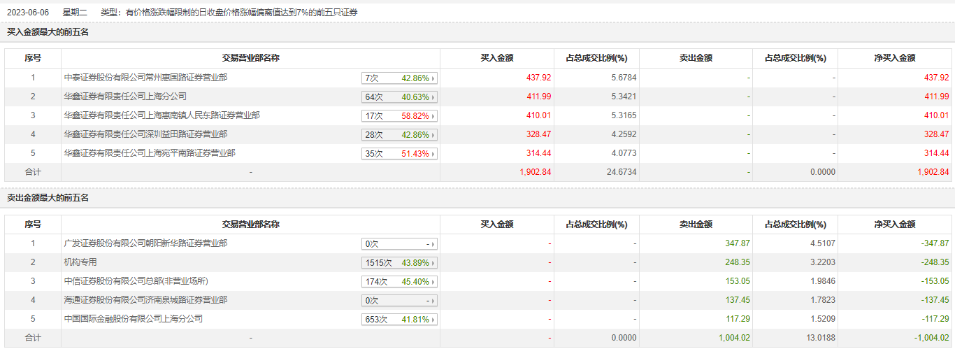 今创集团今日涨停,龙虎榜数据显示,上榜营业部席位全天成交2906.86万元,占当日总成交金额比例为37.69%。其中,买入金额为1902.84万元,卖出金额为1004.02万元,合计净买入898.81万元。