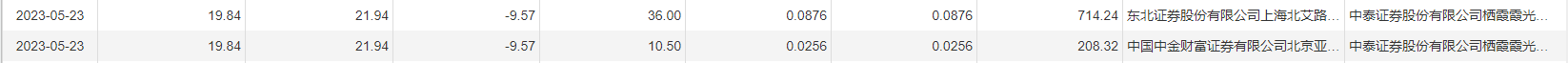 5月23日大宗交易成交299.5万股,成交额5942.08万元,占当日总成交额的27.97%,成交价19.84元,较市场收盘价21.94元折价9.57%。
