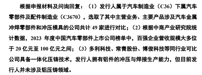 根据中商产业研究院统计数据,2023年度中国汽车零部件上市公司榜单中,百强企业营收规模大多位于20亿元至100亿元之间;多利科技、常青股份、博俊科技等同行业可比公司具备一体化压铸技术,至信股份拥有铝件的冲压与焊接生产能力,但目前至信股份并未涉及铝压铸领域。