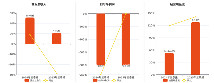 公司营业总收入为4.50亿元,在已披露的同业公司中排名第18,较去年同报告期营业总收入减少6.16亿元,同比较去年同期下降57.79%。归母净利润为-1.51亿元,在已披露的同业公司中排名第25。经营活动现金净流入为1.13亿元。