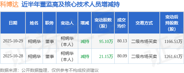 科博达:10月29日高管柯炳华减持股份合计95.1万股