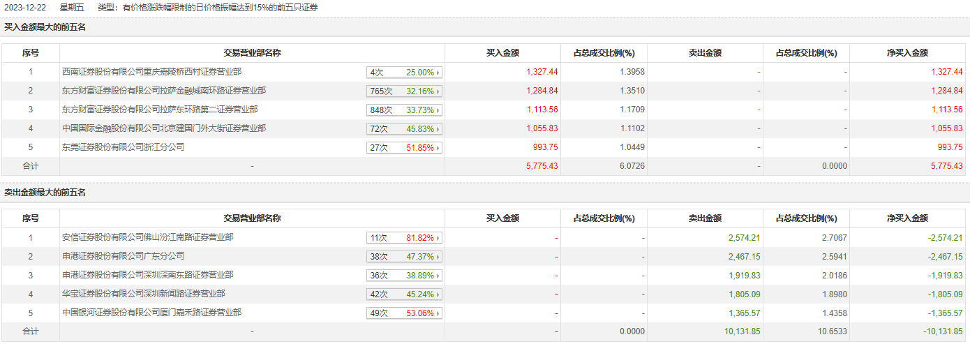 星光农机12月22日跌停,全天换手率达24.68%,振幅达20%。龙虎榜数据显示,营业部席位合计净卖出4356.42万元。其中,安信证券佛山汾江南路证券营业部、申港证券广东分公司分别卖出2574.21万元、2467.15万元;西南证券重庆嘉陵桥西村证券营业部、东方财富证券拉萨金融城南环路证券营业部分别买入1327.44万元、1284.84万元。