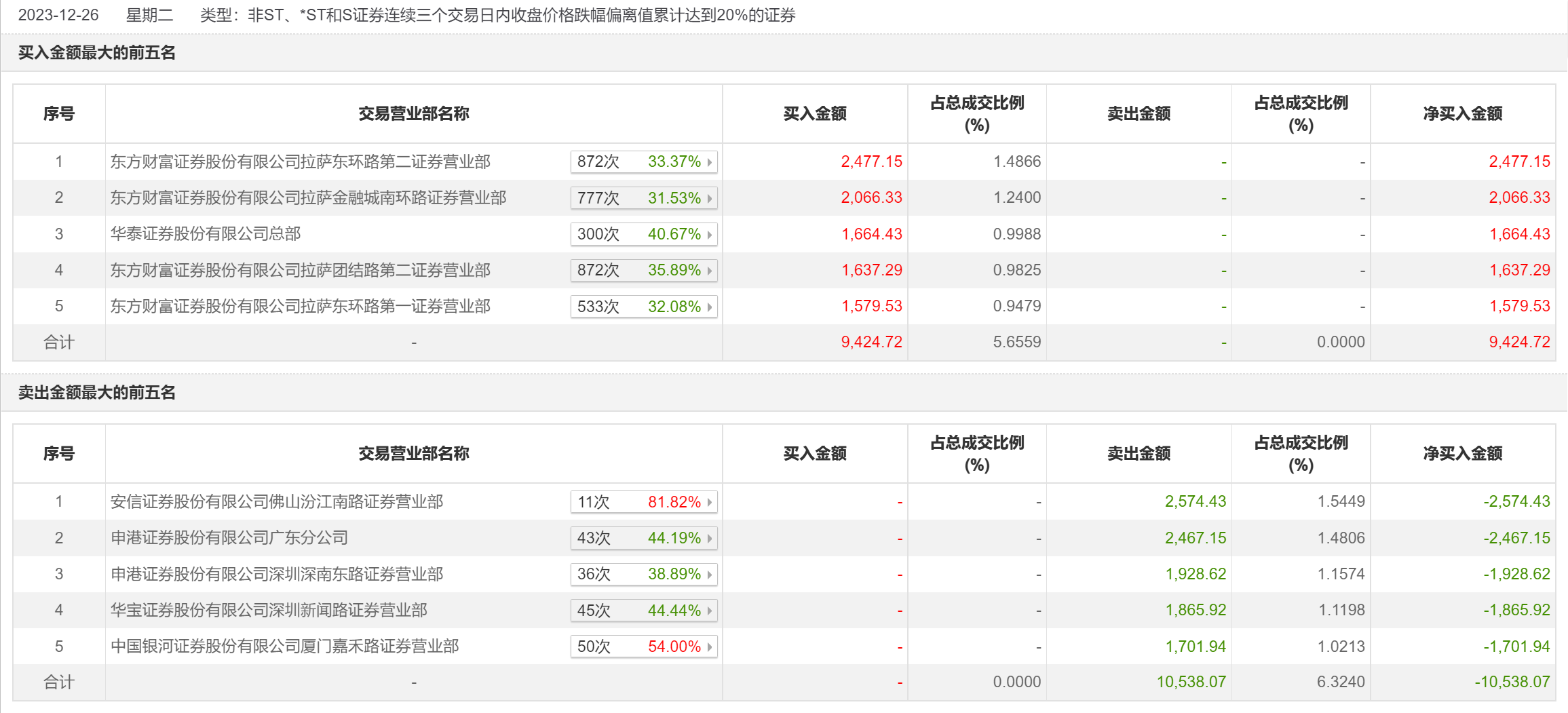 12月26日,星光农机今日跌9.19%,全天换手率达21.29%,振幅达5.96%。龙虎榜数据显示,12月22日至12月26日期间,上榜营业部席位合计净卖出1113.34万元。其中,安信证券佛山汾江南路证券营业部、申港证券广东分公司分别卖出2574.43万元、2467.15万元;东方财富证券拉萨东环路第二证券营业部、东方财富证券拉萨金融城南环路证券营业部分别买入2477.15万元、2066.33万元。