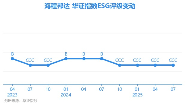 日前,华证指数公布了新一期(2025年7月31日)的ESG评级结果,海程邦达(603836.SH)获得CCC评级(华证指数评级为C起至AAA九档,C为最低档,AAA为其最高一级评级/AA为其第二档),上一期(2025年4月30日)ESG评级为CCC。本期ESG评级在34家航空货运与物流行业A股上市公司中排名第30(上一期排名第31)。