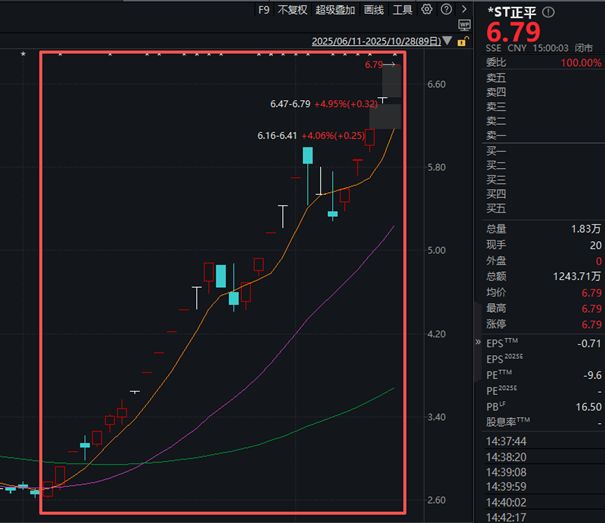 “29天21板”牛股*ST正平(维权)(SH603843,股价6.79元,市值48亿元)10月28日晚间公告称,公司股票自2025年9月1日至10月28日累计涨幅为152.42%,期间21天涨停,5次触及股票交易异常波动。股价上涨过快,为维护投资者利益,公司将自10月29日起停牌核查,预计停牌时间不超过10个交易日。