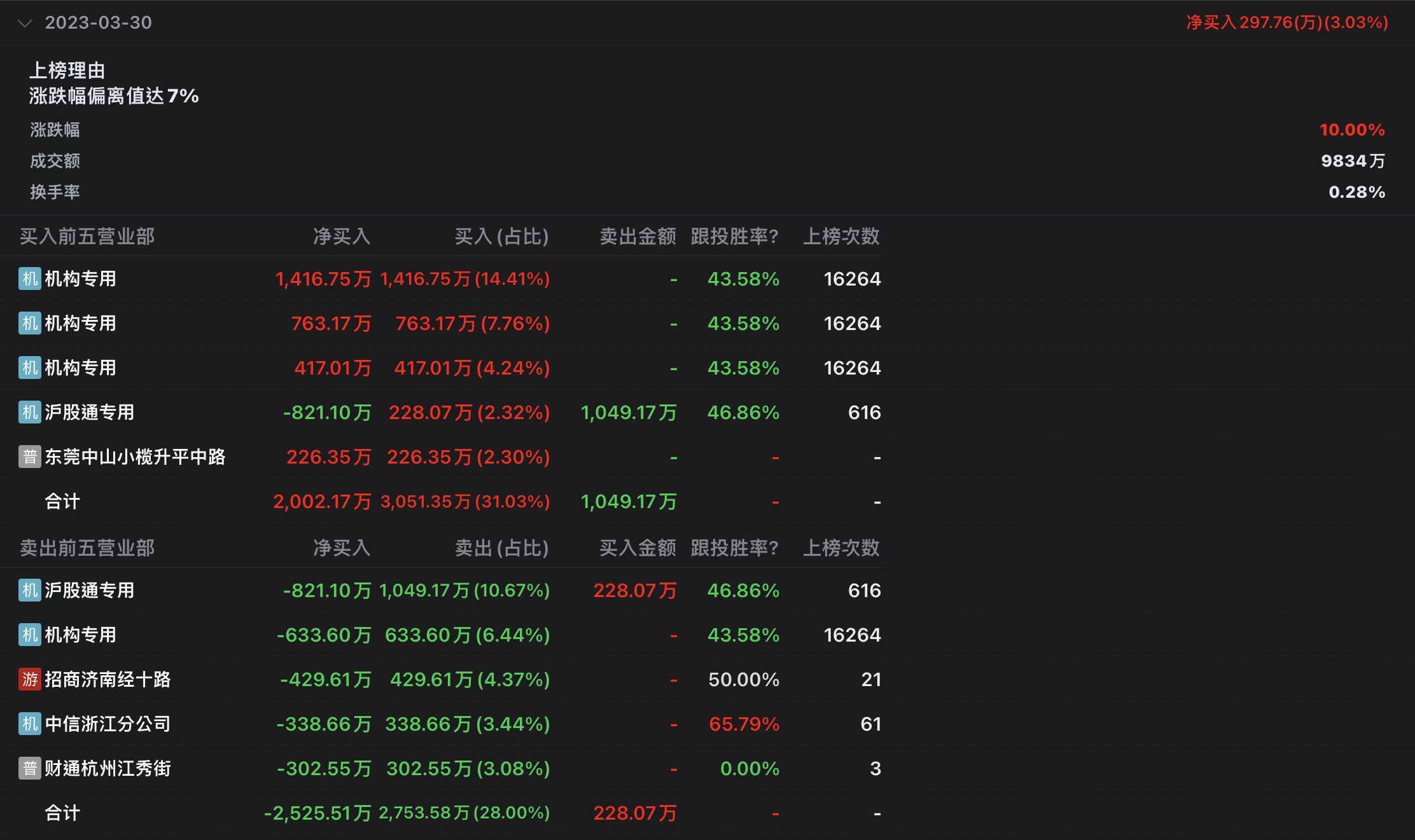 3月30日,飞科电器今日涨停,龙虎榜数据显示,上榜营业部席位全天成交5804.93万元,占当日总成交金额比例为59.03%。其中,买入金额为3051.35万元,卖出金额为2753.58万元,合计净买入297.76万元。