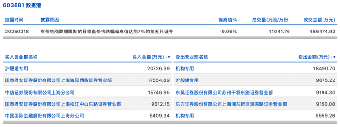 2月18日,数据港今日跌停,龙虎榜数据显示,上榜营业部席位全天成交12.12亿元,占当日总成交金额比例为24.92%。其中,买入金额为6.89亿元,卖出金额为5.23亿元,合计净买入1.67亿元。