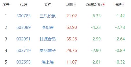 三只松鼠、味知香、甘源食品、良品铺子、煌上煌位列涨幅榜后五位,涨幅分别为-6.33%、-4.23%、-2.99%、-2.90%、-2.81%。