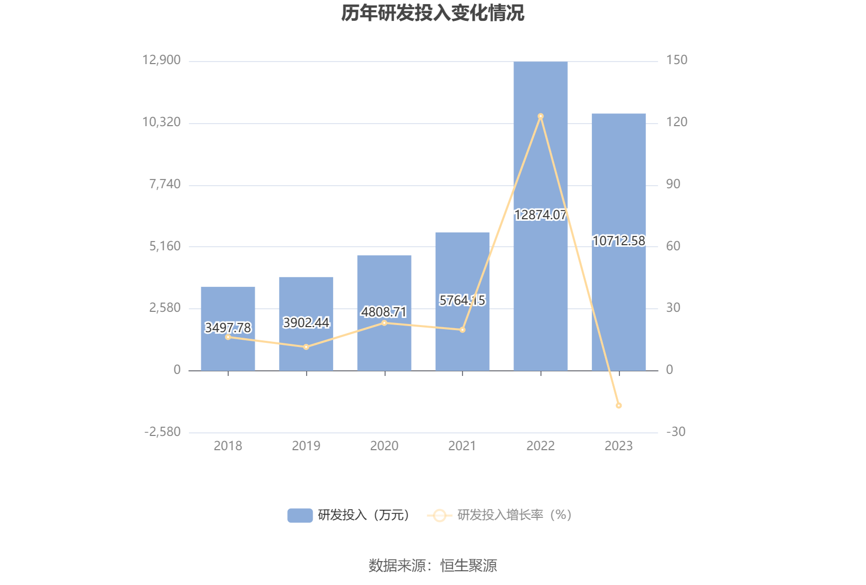 2023年全年,公司研发投入金额为1.07亿元,同比下降16.79%;研发投入占营业收入比例为18.01%,相比上年同期下降4.25个百分点。此外,公司全年研发投入资本化率为5.56%。