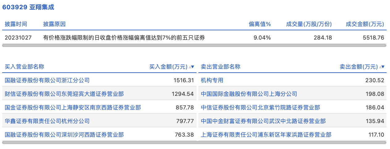10月27日,亚翔集成今日涨停,全天换手率达1.33%,振幅达0%。龙虎榜数据显示,营业部席位合计净买入4362.1万元。其中,机构合计净卖出230.52万元。此外,国融证券浙江分公司、财信证券东莞迎宾大道证券营业部分别买入1516.31万元、1294.54万元;中国国际金融上海分公司、中信证券北京紫竹院路证券营业部分别卖出198.08万元、186.04万元。