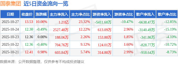 证券之星消息,国泰集团10月27日涨停收盘,收盘价13.53元。该股于10点44分涨停,未打开涨停,截止收盘封单资金为6924.51万元,占其流通市值0.82%。