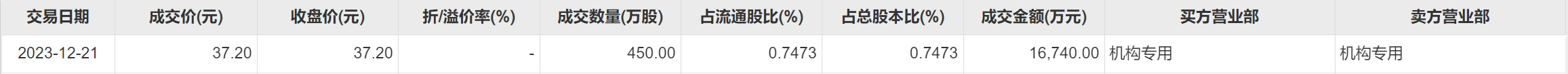 今日大宗交易成交450万股,成交额1.67亿元,占当日总成交额的53.95%,成交价37.2元,较市场收盘价持平。