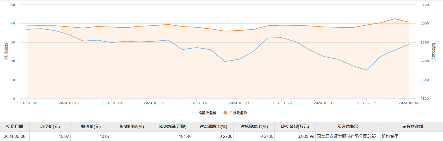 2月8日大宗交易成交164.4万股,成交额6685.99万元,占当日总成交额的15.61%,成交价40.67元,较市场收盘价持平。