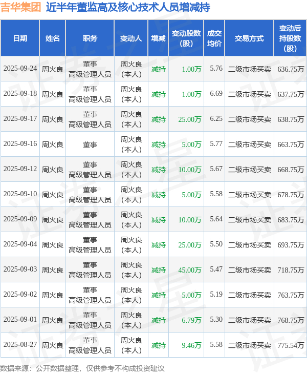 吉华集团近半年内的董监高及核心技术人员增减持详情如下: