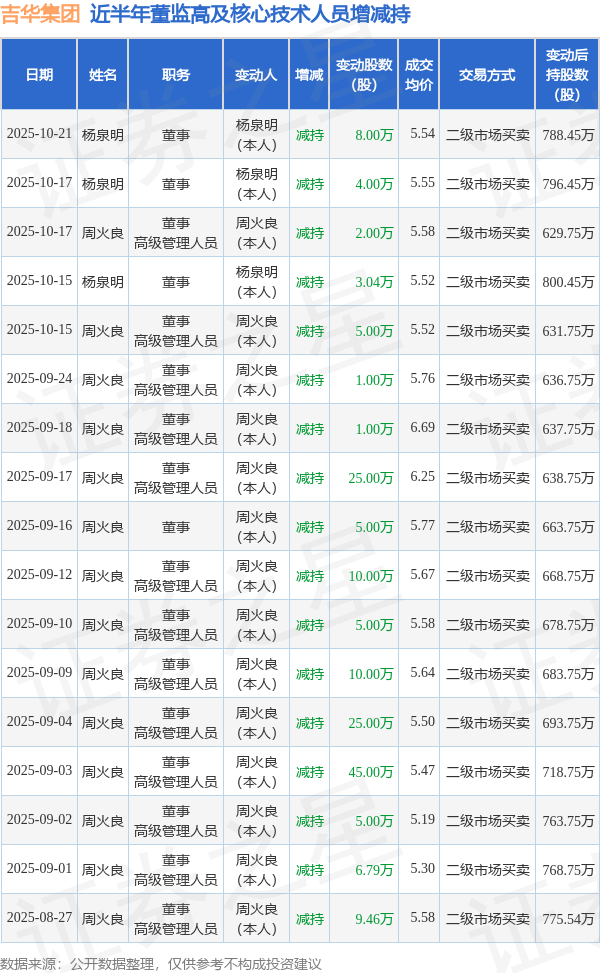吉华集团近半年内的董监高及核心技术人员增减持详情如下: