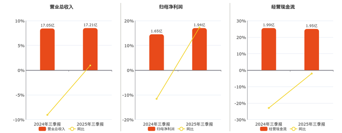 公司营业总收入为17.21亿元。归母净利润为1.94亿元。经营活动现金净流入为1.95亿元,较去年同报告期经营活动现金净流入减少409.63万元,同比较去年同期下降2.06%。