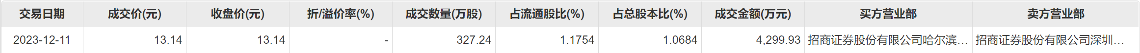 今日大宗交易成交327.24万股,成交额4299.93万元,占当日总成交额的38.85%,成交价13.14元,较市场收盘价持平。