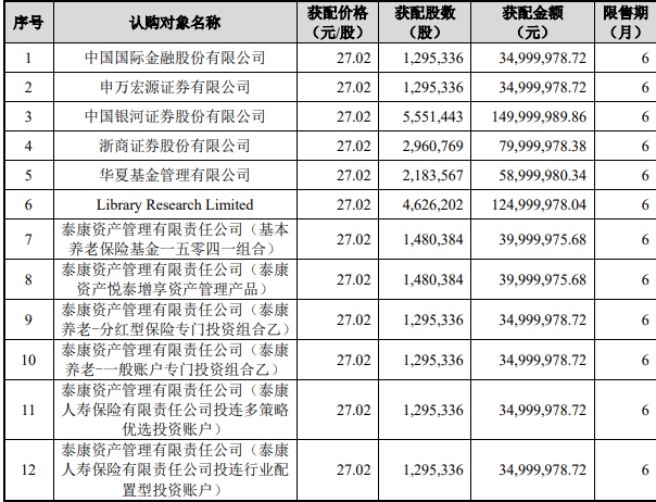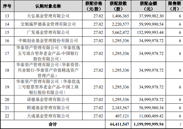 本次拟向22名对象发行4441.15万股,完成募集资金12亿元,发行价格为27.02元/股,