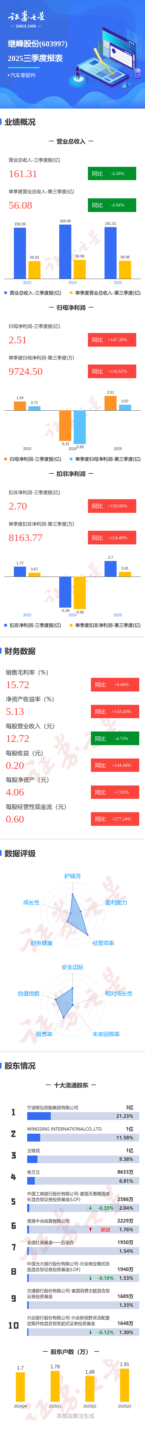 图解继峰股份三季报:第三季度单季净利润同比增长116.62%