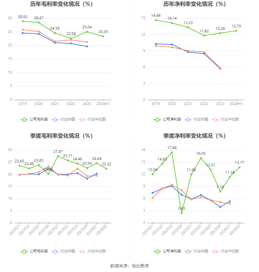 2024年上半年,公司毛利率为23.35%,同比下降3.24个百分点;净利率为12.70%,较上年同期下降1.40个百分点。从单季度指标来看,2024年第二季度公司毛利率为22.32%,同比下降3.45个百分点,环比下降2.32个百分点;净利率为13.77%,较上年同期下降2.28个百分点,较上一季度上升2.39个百分点。