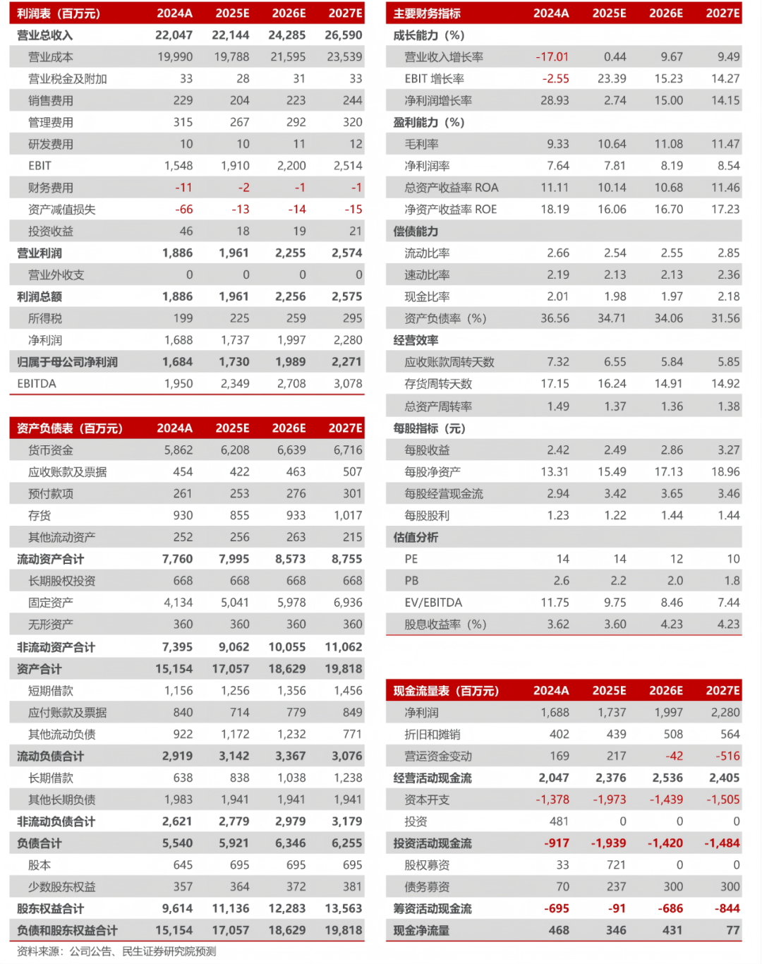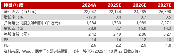 公司三项主业快速发展,协同优势显著,竞争壁垒不断增强,我们预计,2025~2027年公司归母净利润分别为17.30/19.89/22.71亿元,对应EPS分别为2.49/2.86/3.27元/股,对应2025年10月27日收盘价的PE分别为14/12/10倍,维持“推荐”评级。