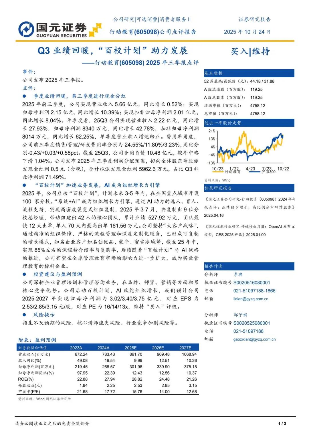 本报告摘自国元证券2025年10月24日已发布的《Q3业绩回暖,“百校计划”助力发展——行动教育(605098) 2025年三季报点评》,具体报告及分析内容请详见报告。若因对报告的摘编等产生歧义,应以报告发布当日的完整内容为准。