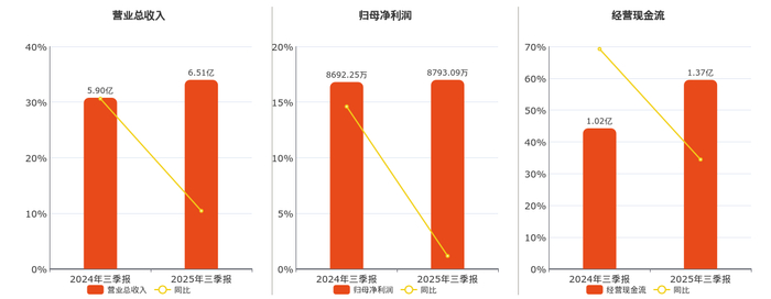 公司营业总收入为6.51亿元。归母净利润为8793.09万元。经营活动现金净流入为1.37亿元。