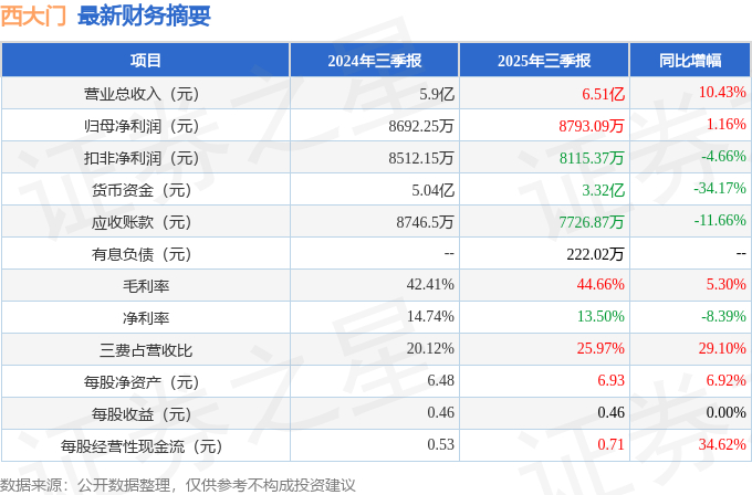 西大门(605155)2025年三季报简析:营收净利润同比双双增长