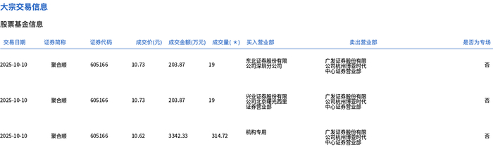 10月10日,聚合顺大宗交易成交352.72万股,成交额3750.07万元,占当日总成交额的30.41%,成交均价10.63元,较市场收盘价11.62元折价8.5%,其中最高成交价10.73元,最低成交价10.62元。